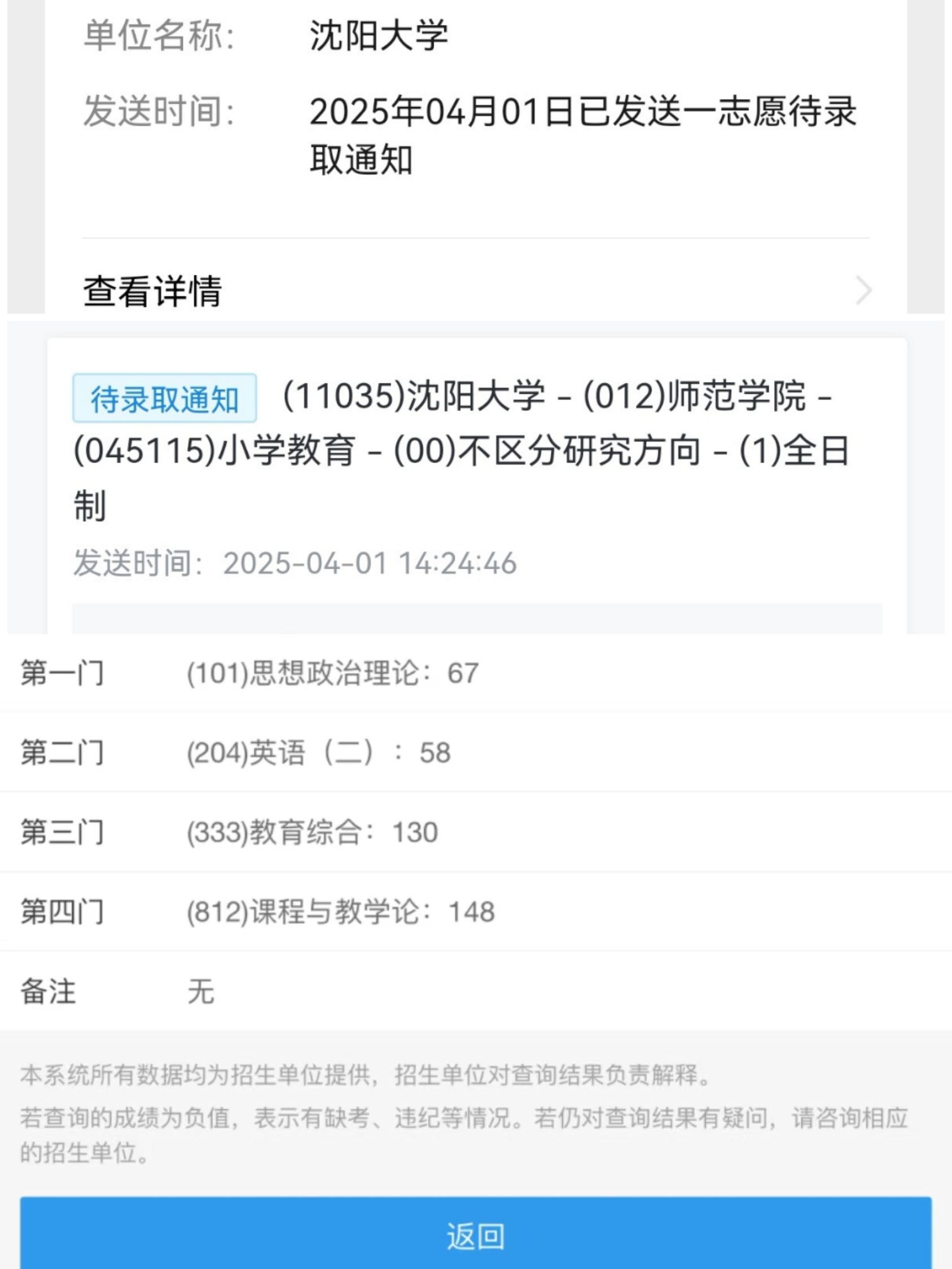 近日,2025年硕士研究生招生考试录取结果陆续公布,2138CC太阳集团传来喜讯,2021级小学教育专业学生苏梦婷成功被沈阳大学小学教育专业录取,其专业科目课程与教学论更是取得了148分的好成绩,在竞争激烈的考研大环境下,这样的高分极为亮眼。