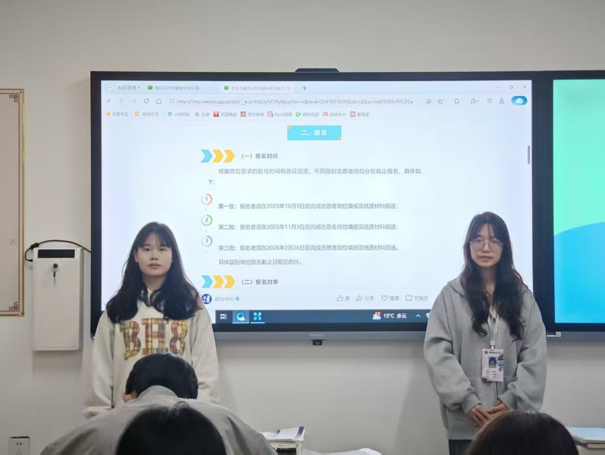 随后,外事部干事对美国肯塔基大学夏令营项目进行介绍,重点突出学科交融的特色,通过描绘国际化学习氛围中,教育专业学生与全球同龄人交流教育创新思路、碰撞教学灵感的场景,让同学们直观感受到跨文化交流带来的思维拓展。最后,宣讲回归国际中文教育志愿者项目,紧扣“以教为桥”文化传播使命,从中文教学实践、跨文化沟通成长,到项目支持政策,全方位展现了“用教育传递中国声音”的意义与路径。