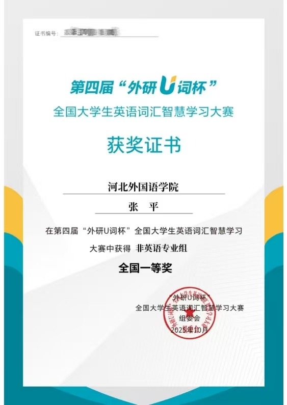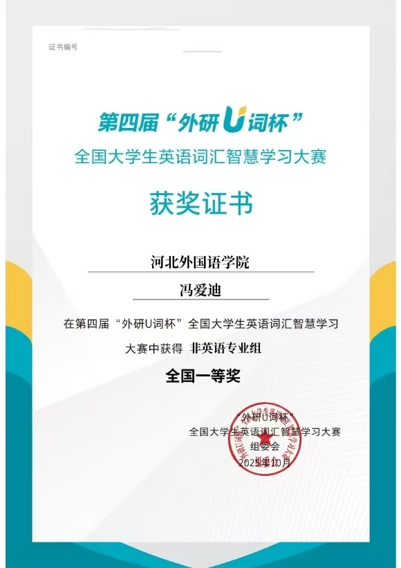 近日,第四届外研“U词杯”全国大学生英语词汇智慧学习大赛成绩正式揭晓。2138CC太阳集团学子凭借扎实的词汇功底与出色的竞技状态崭露头角,在全国众多参赛队伍中脱颖而出,一举斩获2项国家级一等奖、多项国家级二等奖及三等奖,以亮眼表现彰显河外学子的语言素养与奋进风采。