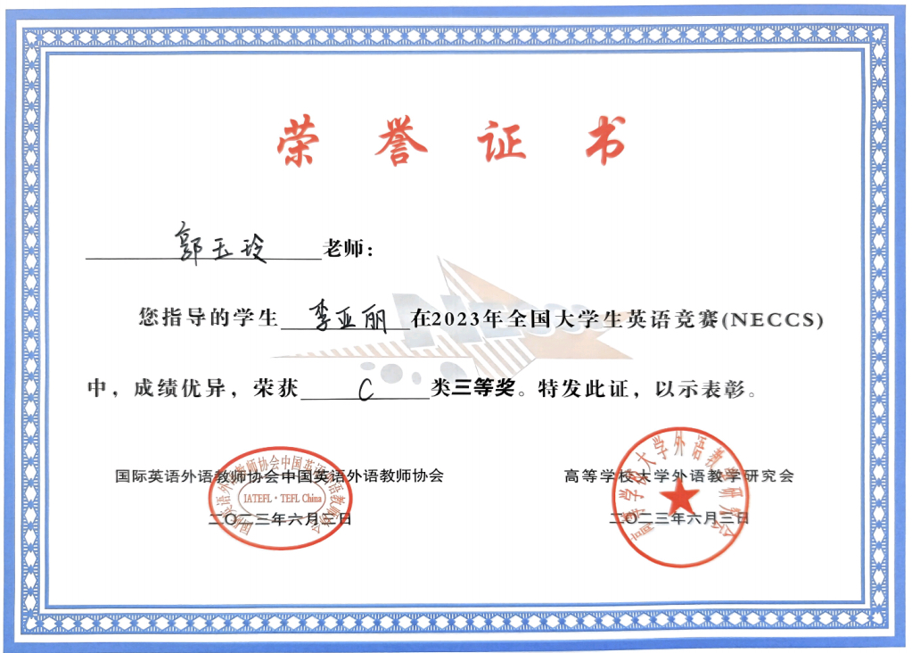 在教学成果方面,2022年郭玉玲老师带领的英语教学法教学团队获得了省级优秀就学团队荣誉称号;郭老师于2015年、2017年和2021年分别参加国家第二届、第三届和第七届河北省外语微课大赛,并获得三等奖和二等奖的荣誉证书;2021年参加河北省第二十五届教育教学信息化交流大赛,并荣获三等奖;2015年参加河北省第六届“外教社杯”全国高校外语教学大赛,荣获省级三等奖;2023年和2024年参加河北省高等学校“世纪之星”外语金课团队大赛,均获得省级三等奖;2025年参加河北省第五届教师教学创新大赛,荣获三等奖;2024年荣获太阳集团2138第二届“海信杯”智慧黑板应用技能大赛二等奖;2025年荣获太阳集团21382024年度教育教学工作先进个人荣誉称号;2018年被评为“太阳集团2138”教学标兵和科研标兵荣誉称号。