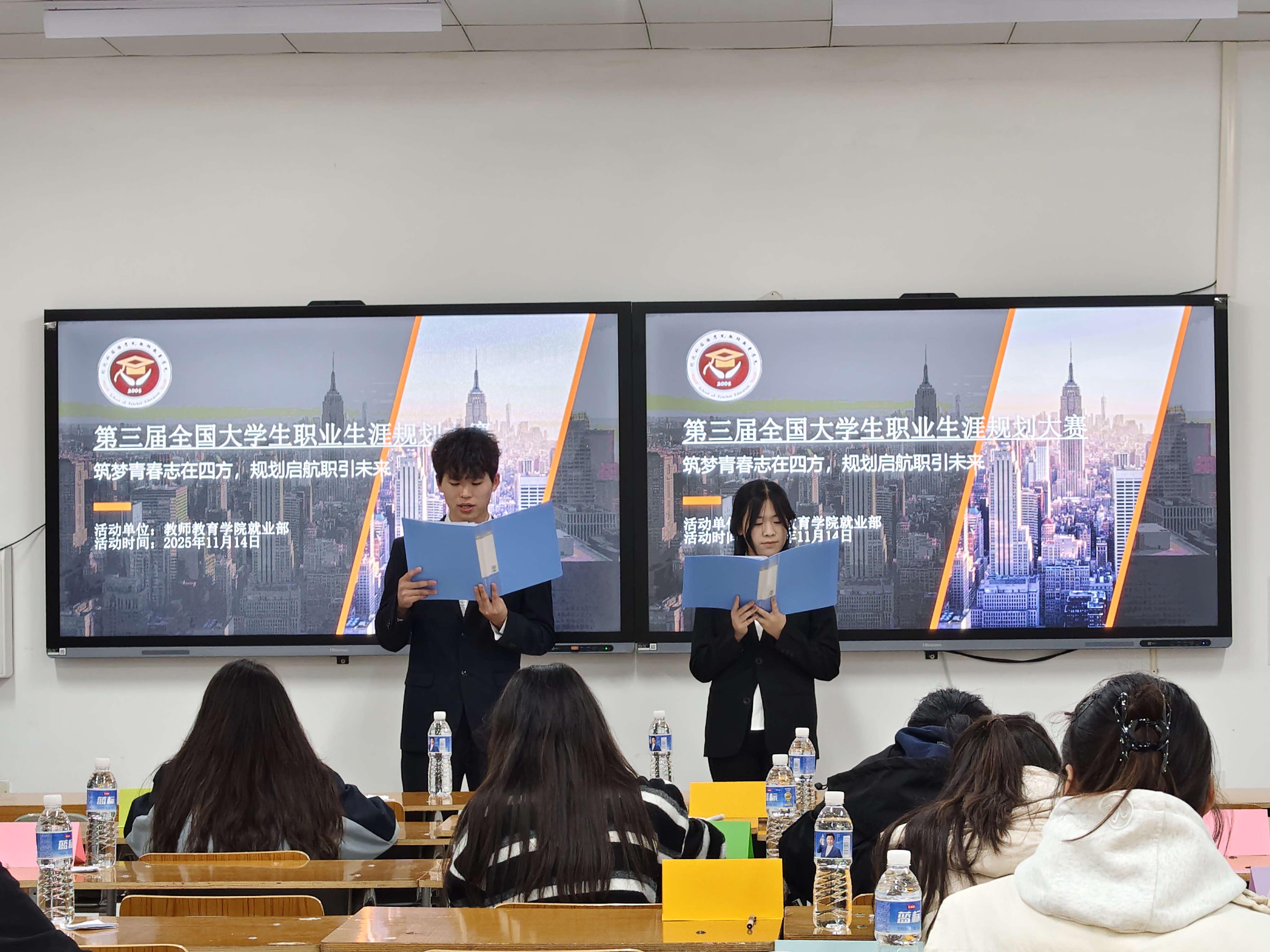 比赛现场,参赛选手们紧扣师范专业特色,结合自身成长经历与教育理想,从职业环境分析、自我认知评估、短期目标与长期规划、实施策略与调整方案等方面展开精彩展示。有的选手瞄准教育科研与课程开发方向,结合当下教育数字化转型趋势,提出了 “教学 + 科研” 双轨发展的职业路径;还有的选手关注小学教育、学前教育等细分领域,展现了对教育多元化需求的深刻洞察与责任担当。选手们逻辑清晰的阐述、生动鲜活的案例分享,赢得了评审团的充分肯定与现场观众的阵阵掌声。