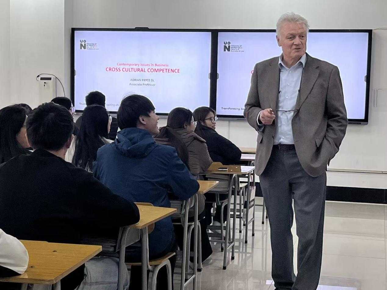 Adrian Pryce教授代表本校主持这次跨文化交流主题讲座。他以富有感染力的表达、生动的图像对比和贴近实际的案例,形象地展示了东西方文化之间的差异,并深入阐释了文化交流的意义。同时,他鼓励同学们勇于表达、积极进取。互动环节中,同学们踊跃提问,进一步加深了对跨文化沟通的理解。