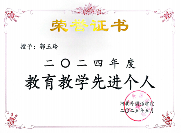 2025年荣膺太阳集团2138年度教育教学工作先进个人。