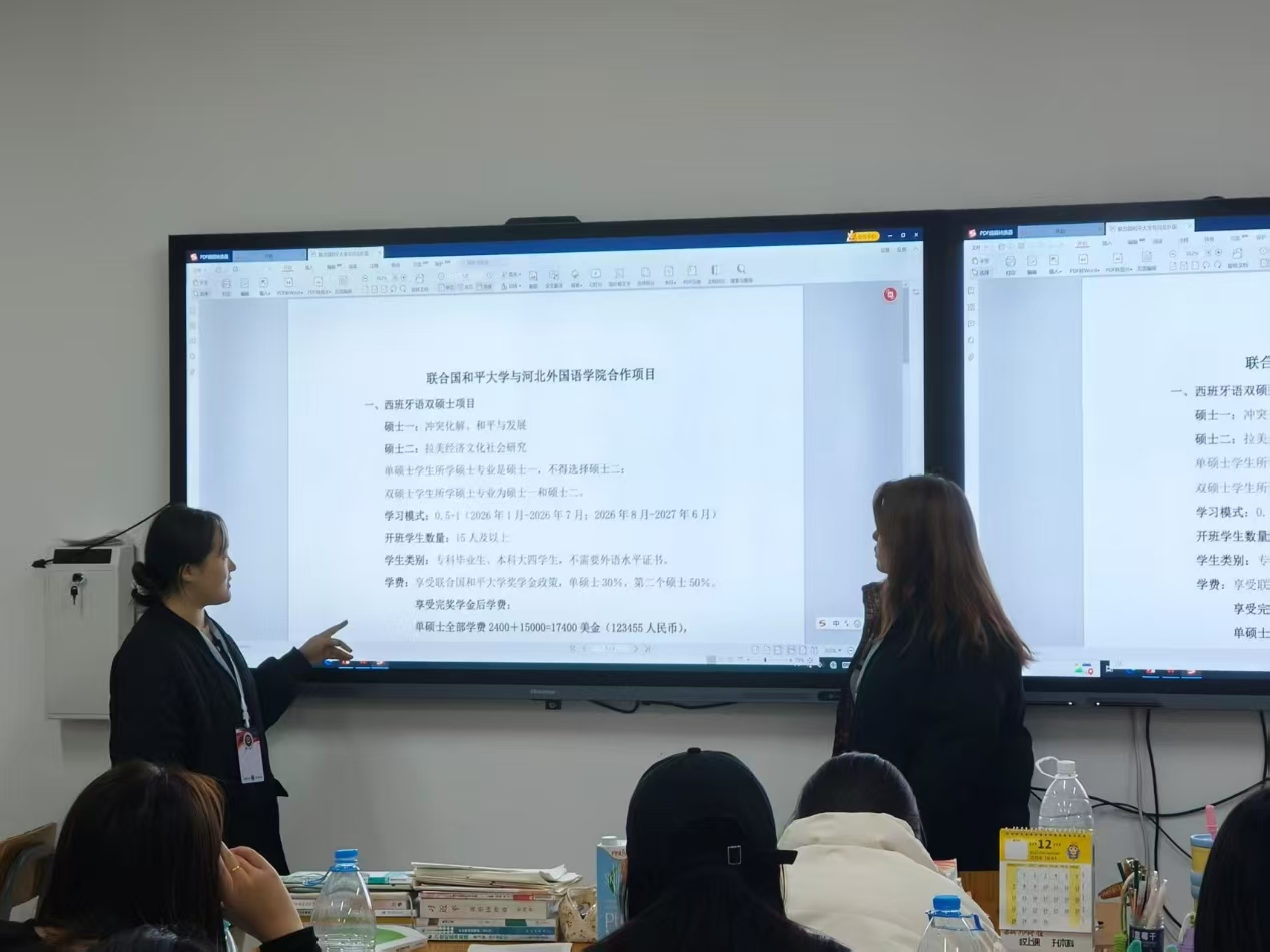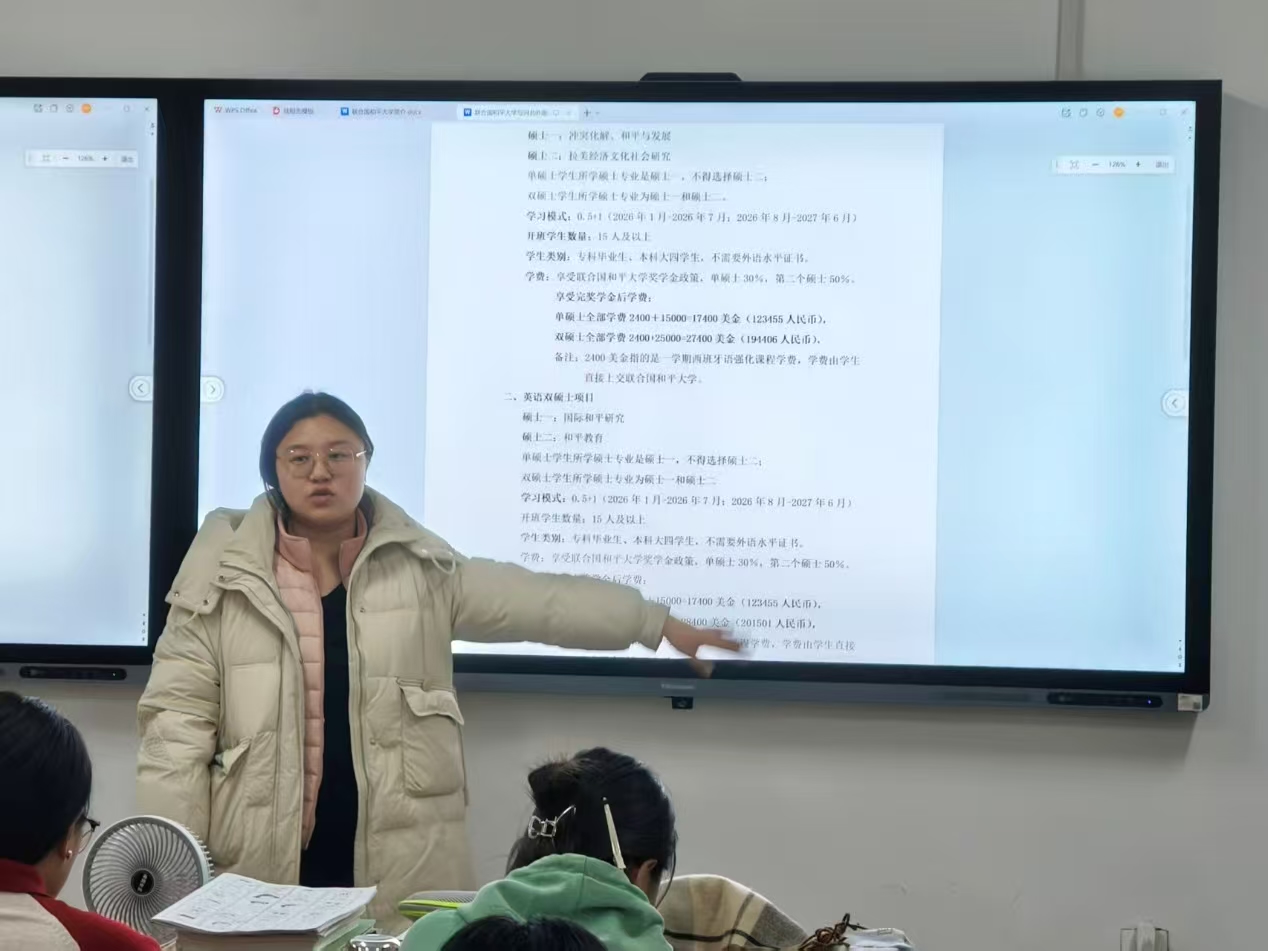 宣讲中,于老师介绍了项目核心内容。该合作项目涵盖西班牙语及英语双硕士项目、国际经贸规则硕士和博士专业联合培养等多元方向,采用“0.5+1”分段培养模式。专科毕业生及本科大四学生可免外语水平证书申请,且享有专项奖学金政策,毕业生所获学位不仅获联合国大会授权,更通过中国教育部认可,实现学术价值与就业竞争力的双重保障。